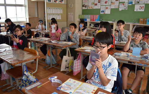 [写真/正しい歯の磨き方を実習する5年生 ]