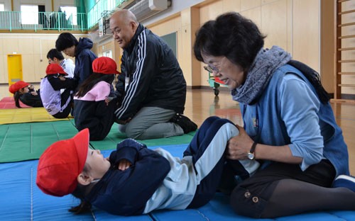 [写真/「上体起こし」で児童を励ましながら足を支えるボランティア ]