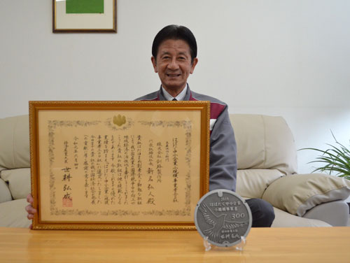 [写真/贈られた感謝状を前に喜びを語る新名社長 ]