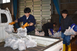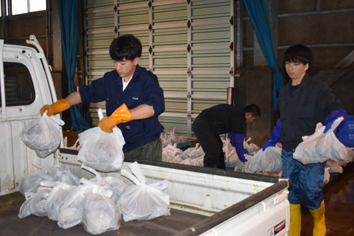 [写真/袋詰めしたホタテを取りに来た車の荷台に載せる同部会のメンバー ]