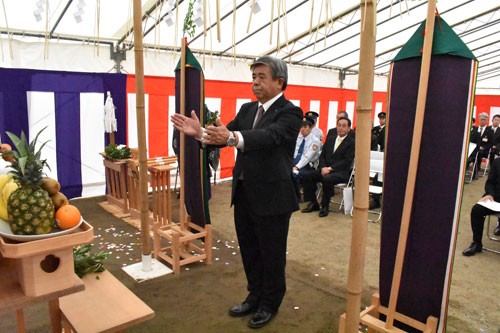[写真/工事の安全を願い玉串をささげる棚野町長 ]