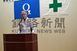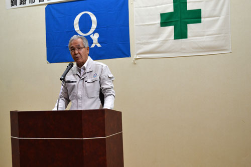 [写真/合同労働安全大会であいさつする亀岡会長 ]