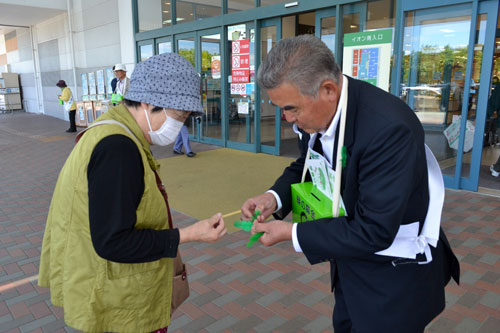 [写真/募金を呼び掛ける濱木会長(右) ]