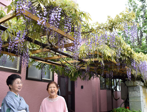[写真/満開の藤棚の下で田中さん(右)と藤間真三代師匠 ]