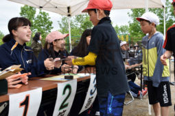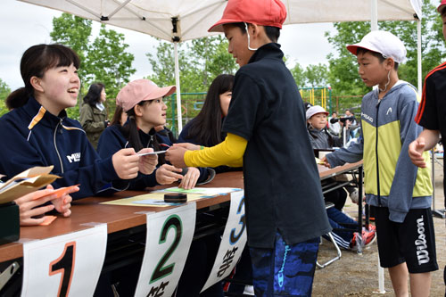 [写真/競技を終えた児童にカードを渡すコンピュータ・ボランティア部の部員 ]