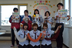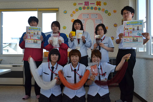 [写真/販売を始める「魚網タオル」などを手にする釧路ヤクルトの販売スタッフら ]