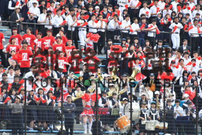 [写真/ブラスバンド、チアリーディング、応援団の「軍楽隊」総出演でナインに声援を送る釧路湖陵の生徒ら ]