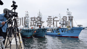 [写真/メディアの関心も高く、出航する船団に大勢のカメラが向けられた(釧路港北埠頭、1日午前9時40分ごろ) ]