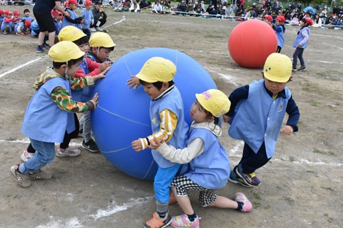 [写真/大玉をリレーする年中児の「大玉ころがし」(十條ひまわり幼稚園) ]