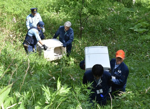 [写真/山中に不法投棄された冷蔵庫などを撤去した合同パトロール ]