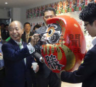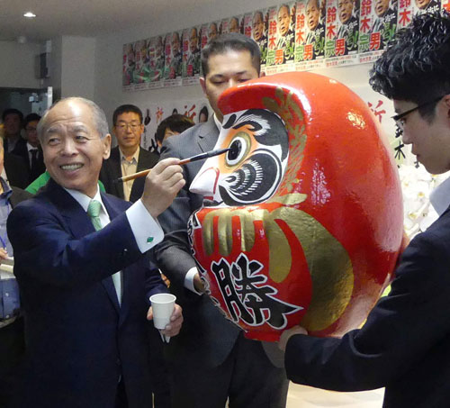 [写真/事務所開きでだるまに目を入れ、当選への戦いを誓う鈴木宗男]