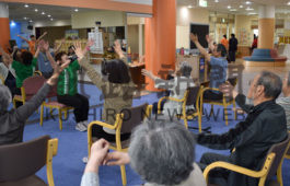 [写真/浦瀬さんの指導でチェアーエアロに取り組む利用者 ]