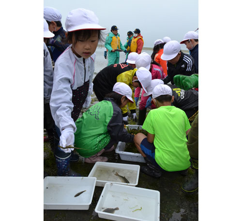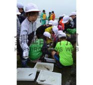 [写真/網に掛かった魚を分別する児童 ]