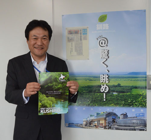 [写真/大阪圏の各支店に掲示したポスターを背に釧路の観光振興に貢献していきたいと―高野支店長  ]