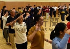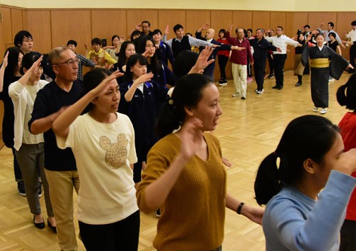 [写真/講習会で千人踊りの練習をする参加予定者 ]