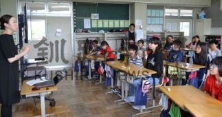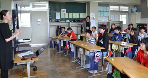 [写真/門脇さん(左)の説明に真剣な表情で聞き入る児童ら ]