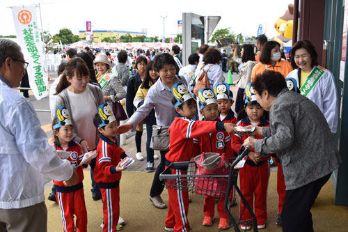 [写真/啓発グッズを配る昭和スポーツ幼稚園の園児ら ]