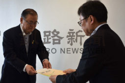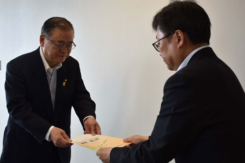 [写真/伊藤部長(右)に要望書を手渡す石垣会長 ]