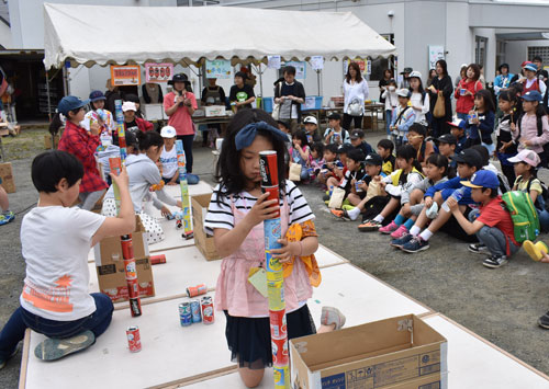 [写真/盛り上がったアトラクション「あきかんバランス」(芦野児童センター) ]