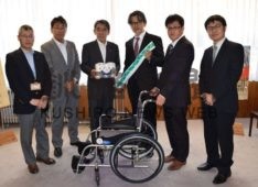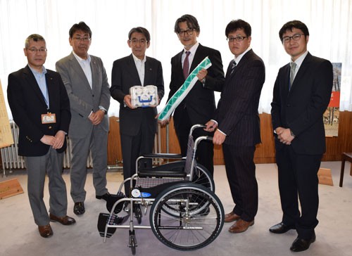 [写真/車椅子などの医療機器を寄贈した東北海道病院の木村理事長(中央右) ]
