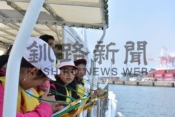 [写真/船上でメモを取りながら西港を見学する児童 ]