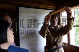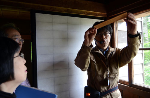 [写真/柾葺屋根の特徴を説明する戸田学芸員 ]