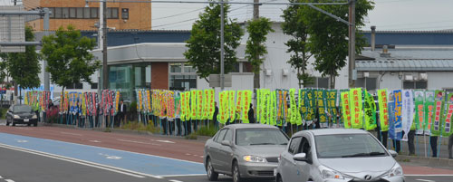 [写真/交通安全啓蒙のため約100㍍にわたりつくられた旗の波 ]