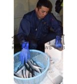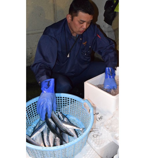 [写真/水揚げされたサンマの匹数と重さを確認する市場職員(10日午前3時20分ごろ) ]