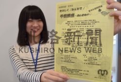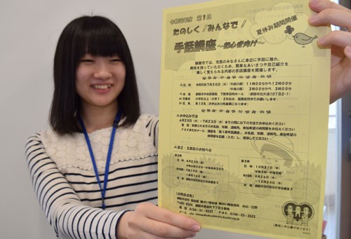 [写真/手話講座のチラシを持ち、参加を呼び掛ける職員 ]