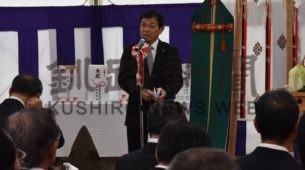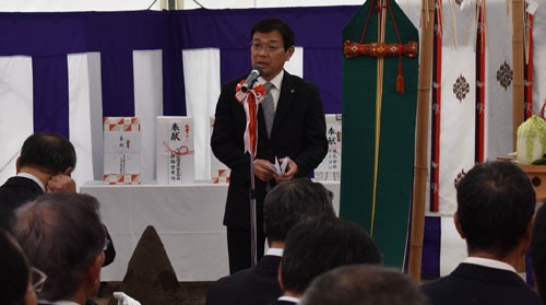 [写真/あいさつする大石村長 ]