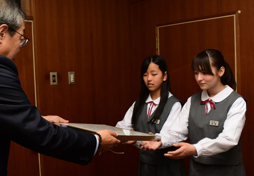 [写真/贈呈状を受け取る阿部委員長(右)と三浦副委員長 ]