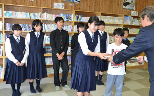 [写真/堀口常務から賞状を受ける梅津君と南さん(手前右から)と2委員会の児童生徒 ]
