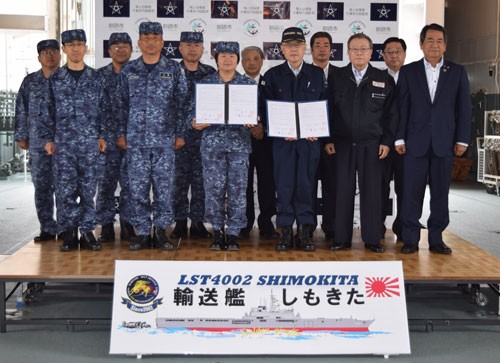 [写真/協定書を取り交わした伴副市長(中央右)と近藤海将補(同左) ]