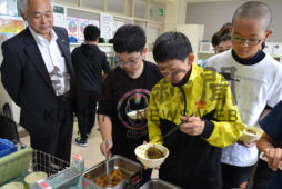 [写真/お代わりの列に並ぶ児童に目を細める小松町長(左) ]