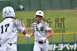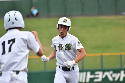 [写真/【1回戦、武修館―網走南ヶ丘】2回、先制打を放ち、一塁上で雄たけびを上げる武修館の舘岡 ]