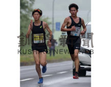 [写真/ハーフ男子総合1位の武石大地さん(右)。実業団選手と終盤まで並走しペースを保った(本間玲子撮影) ]