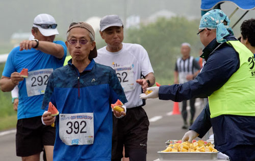 [写真/救援スポットにて、スイカとトウキビで栄養補給する参加者(本間玲子撮影) ]
