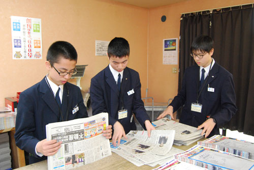 [写真/販売店で研修する道教育大学附属釧路中学校の3人 ]