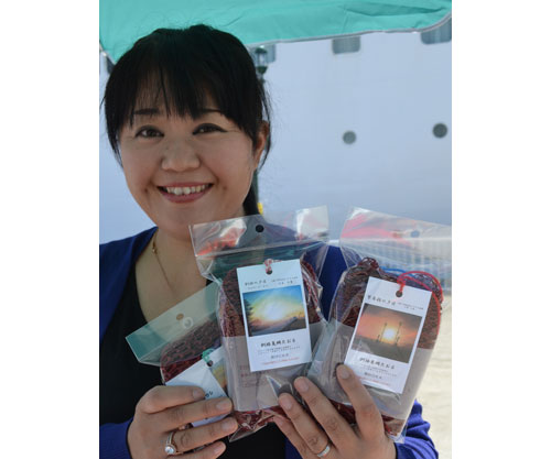 [写真/小泉さんの作品が添えられたコラボ企画の魚網タオルとタワシ ]
