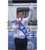 [写真/街頭演説で支持を訴えた勝部氏(17日正午すぎ、釧路市役所前) ]