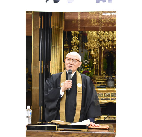 [写真/講演する大阪府因念寺の淺田住職 ]