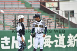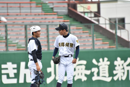 [写真/釧湖陵の齋藤主将(左)と先発森下。再三の危機もバッテリーで乗り越え、試合をつくった ]