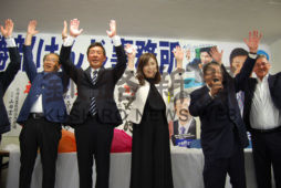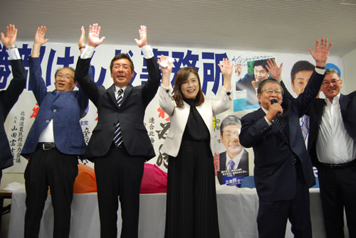 [写真/初陣を飾って万歳する勝部賢志氏と美香夫人=21日午後8時10分ごろ、札幌市中央区の選対事務所 ]