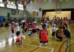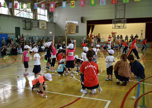 [写真/㊤3、4、5歳児の団体競技「紅白玉入れ」(美原認定こども園)㊦競技を終え、頑張った証しのメダルを胸に笑顔の園児(わかばフレンド) ]