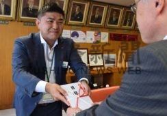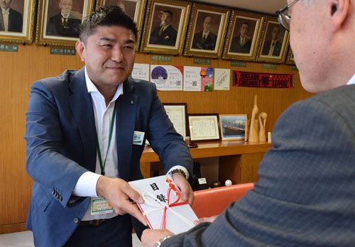 [写真/伴副市長に目録を手渡す落合支社長(左) ]
