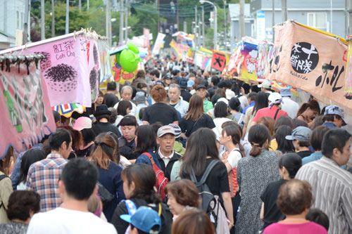 [写真/神社境内(上)につながる道路は、両脇の露店に集まった大勢の人でごった返した ]