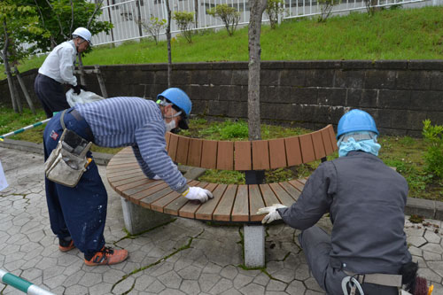 [写真/地域貢献でベンチの塗装を行う社員ら ]