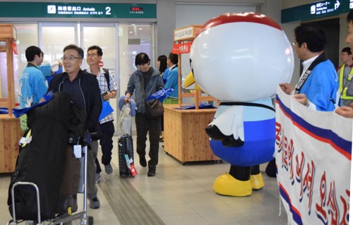 [写真/チャーター便で空港に到着した韓国からの観光客 ]
