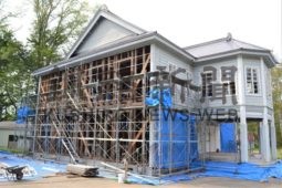 [写真/外壁解体中の本館。間柱の組み方や筋交いの入れ方などから、過去数度にわたり工事が行われた痕跡が残る ]