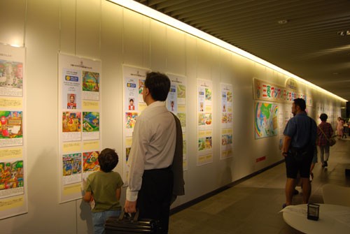 [写真/展示されたアジアの子供たちの絵日記に見入る市民ら ]